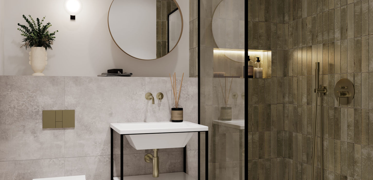 Every bathroom has been thoughtfully crafted to be a private oasis where future homeowners can unwind in style. Fully tiled wet areas with contemporary slimline tiles and concrete-inspired floor and wall tiling create a timeless modern look. A ceiling-hung round mirror and a freestanding stone basin bathroom vanity add an elegant touch, while brushed brass fixtures enhance the luxurious feel.